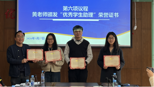 会上,政研室主任朱旺力老师对学生助理提出三点要求:一是常主动,靠前思考、复盘经验,杜绝被动应付,以主动作为提升工作质效。二是常投入,端正工作态度,摒弃消极心态,把工作做细做实,切实扛起岗位职责。三是常奉献,担当作为,立足岗位服务大局、服务师生,以优秀骨干为榜样,在奉献中成长进步。政研室副主任黄谦老师为邓华香、胡胜、代雨鑫、李雨柔颁发“优秀学生助理”证书。